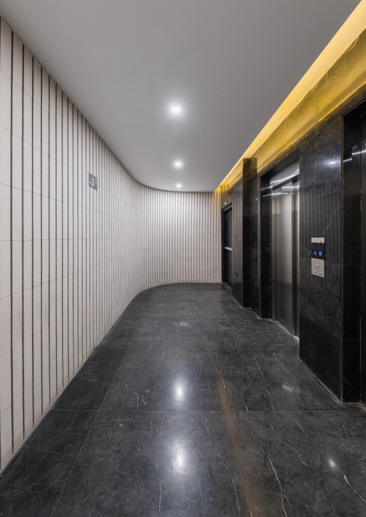 • لابی طبقات: سنگ کف و بدنه مرمریت مشکی ماکو ترکیب با دربهای چوبی داکت و آیینه کاری