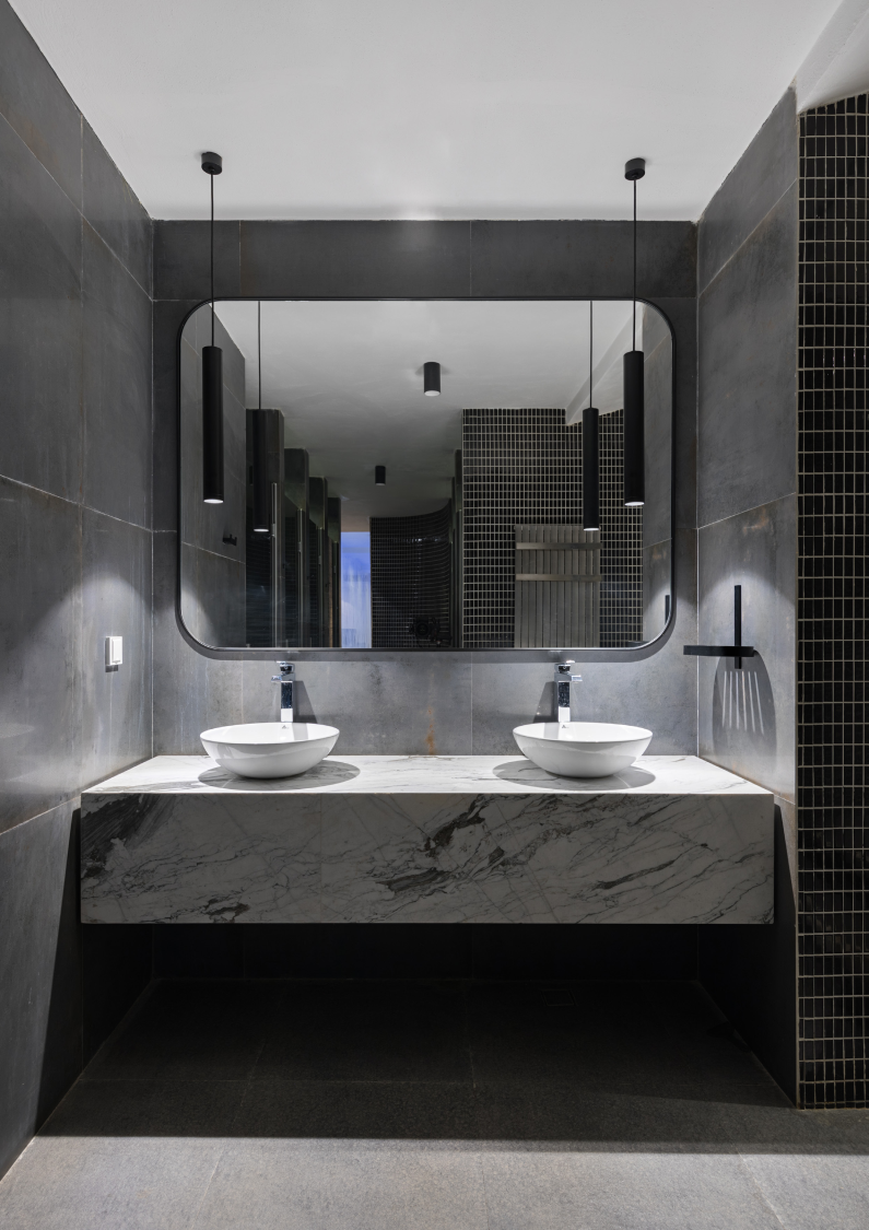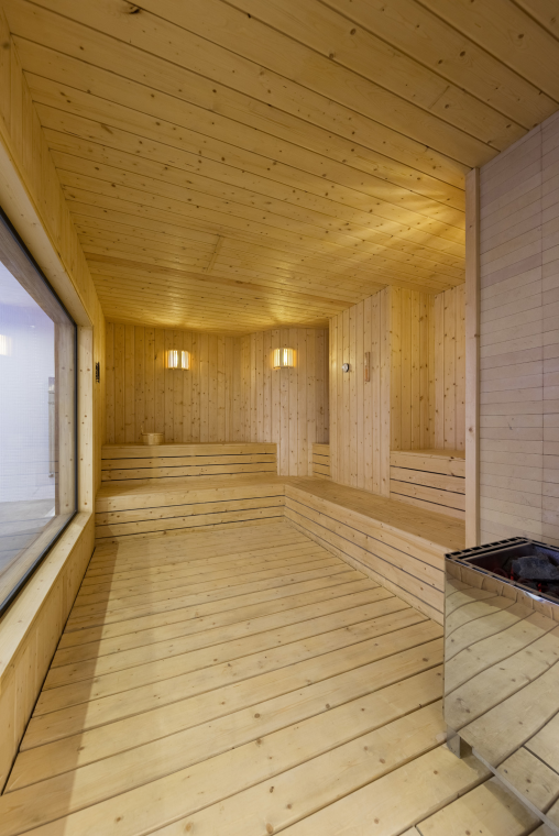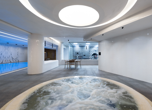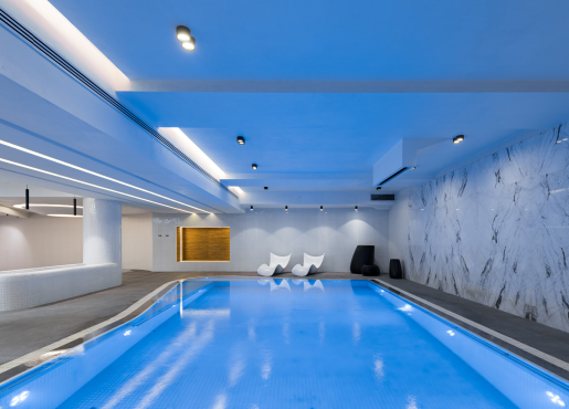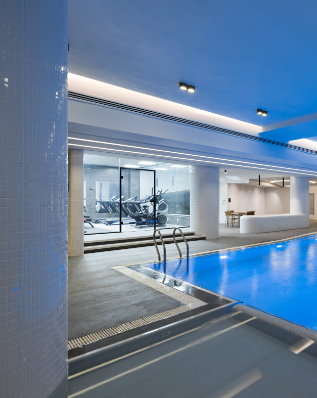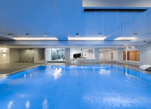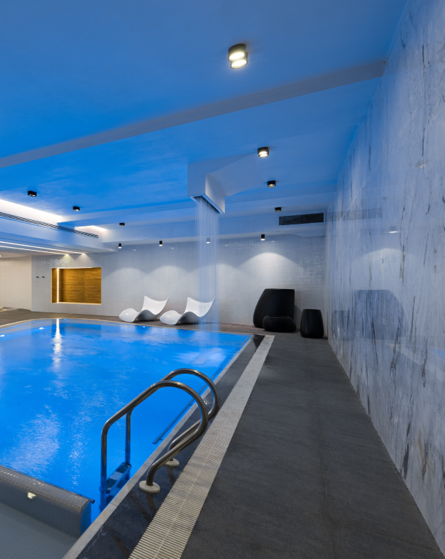 استخر اصلی با ابعاد استاندارد و طراحی مدرن، مرکز این مجموعه را تشکیل میدهد. در کنار آن، بخشهای سونا خشک و بخار، جکوزی و اتاق ماساژ تجربهای کامل از آرامش و بازتوانی جسمی را برای ساکنان فراهم میکنند.